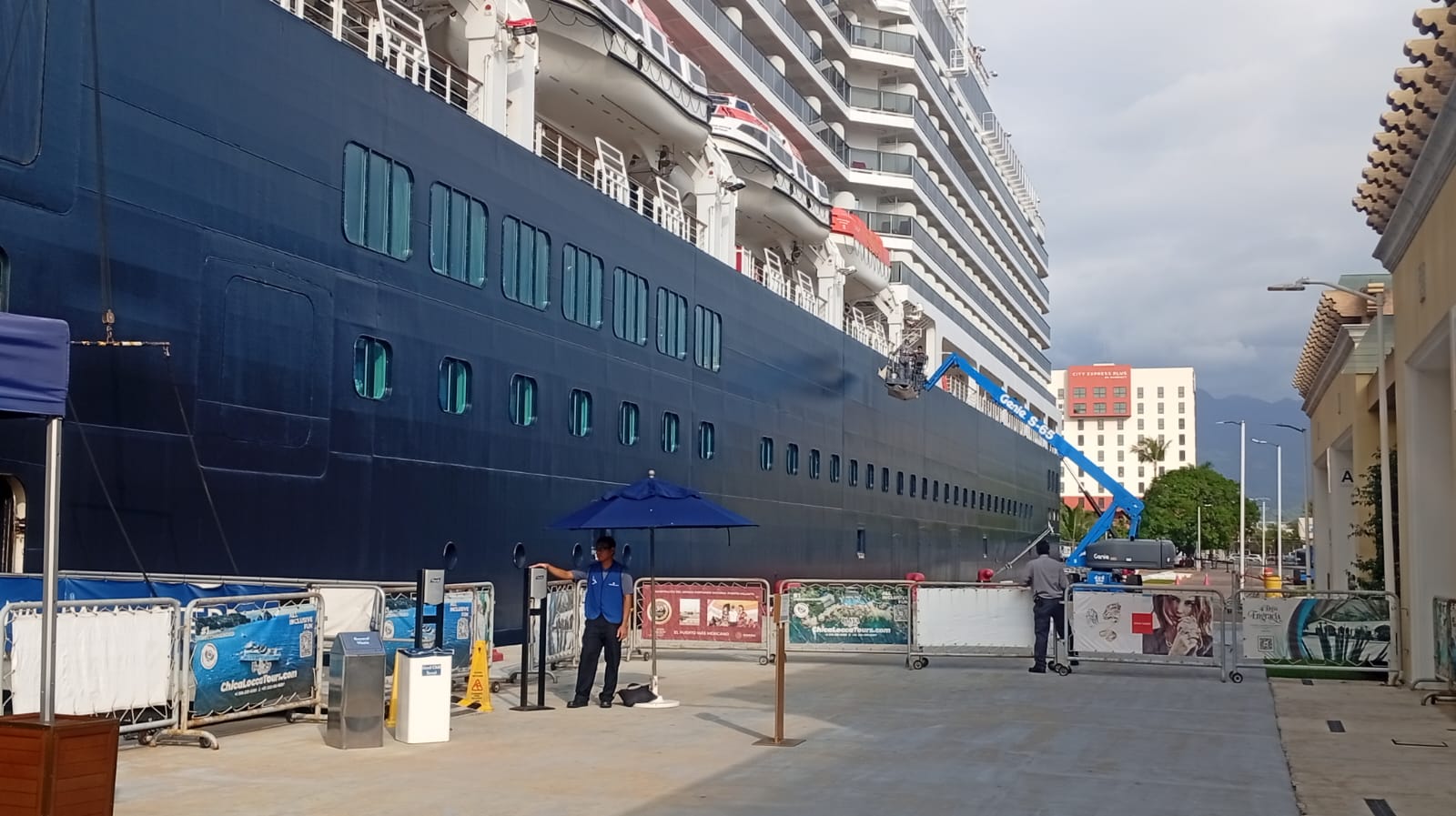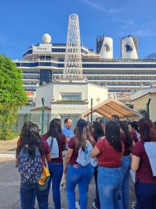 Antes de las 08:00 horas, como parte de una visita académica, los estudiantes observaron las operaciones de arribo, atraque y desembarque del Nieuw Amsterdam, conocieron de la derrama económica que generan los arribos de cruceros, los servicios que se prestan, la logística de servicios de tour operadores, guías de turistas, taxis, el comercio de artesanías, alimentos, productos y demás servicios que se activan para ofrecer la calidad y calidez que se brindan en Puerto Vallarta.