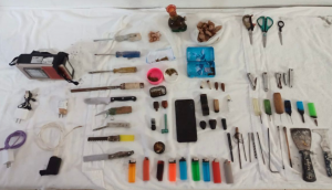 Además, fueron decomisados un teléfono celular, 20 varillas metálicas, cinco hojas metálicas con mango, nueve encendedores, tres tijeras y cuatro cargadores de celular.
