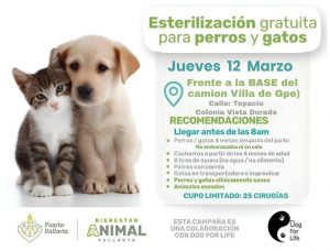 La Dirección de Bienestar Animal, en colaboración con Dog for Life, llevarán a cabo la próxima jornada de esterilización gratuita en la colonia Vista Dorada, específicamente en la calle Topacio, frente a la base de camiones Villa de Guadalupe.