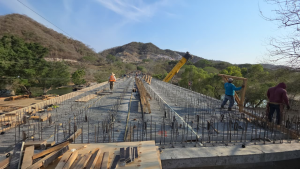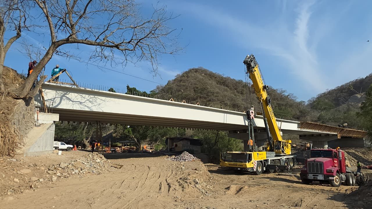 La reconstrucción del puente La Desembocada registra un avance significativo tras la colocación de las últimas trabes de concreto ue conforman su estructura.