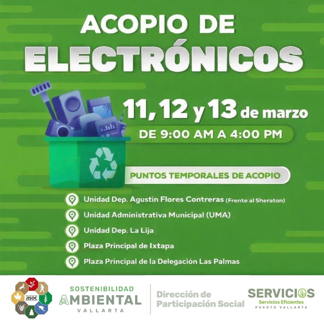 Puerto Vallarta se encamina a ser una ciudad más responsable con el medio ambiente con la campaña de Acopio de Electrónicos que impulsa el gobierno del arquitecto Luis Ernesto Munguía González, a través de la Dirección de Sostenibilidad Ambiental, invitando a las y los vallartenses a sumarse a esta jornada que se realizará los días 11, 12 y 13 de marzo, en un horario de 9:00 de la mañana a 4:00 de la tarde, en distintos puntos del municipio.