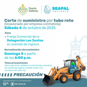De acuerdo a lo que informó el Seapal a través de redes sociales La reparación de la tubería afectada se realizará este domingo por la mañana y se presentará cierre parcial de vialidad, toma precauciones.
