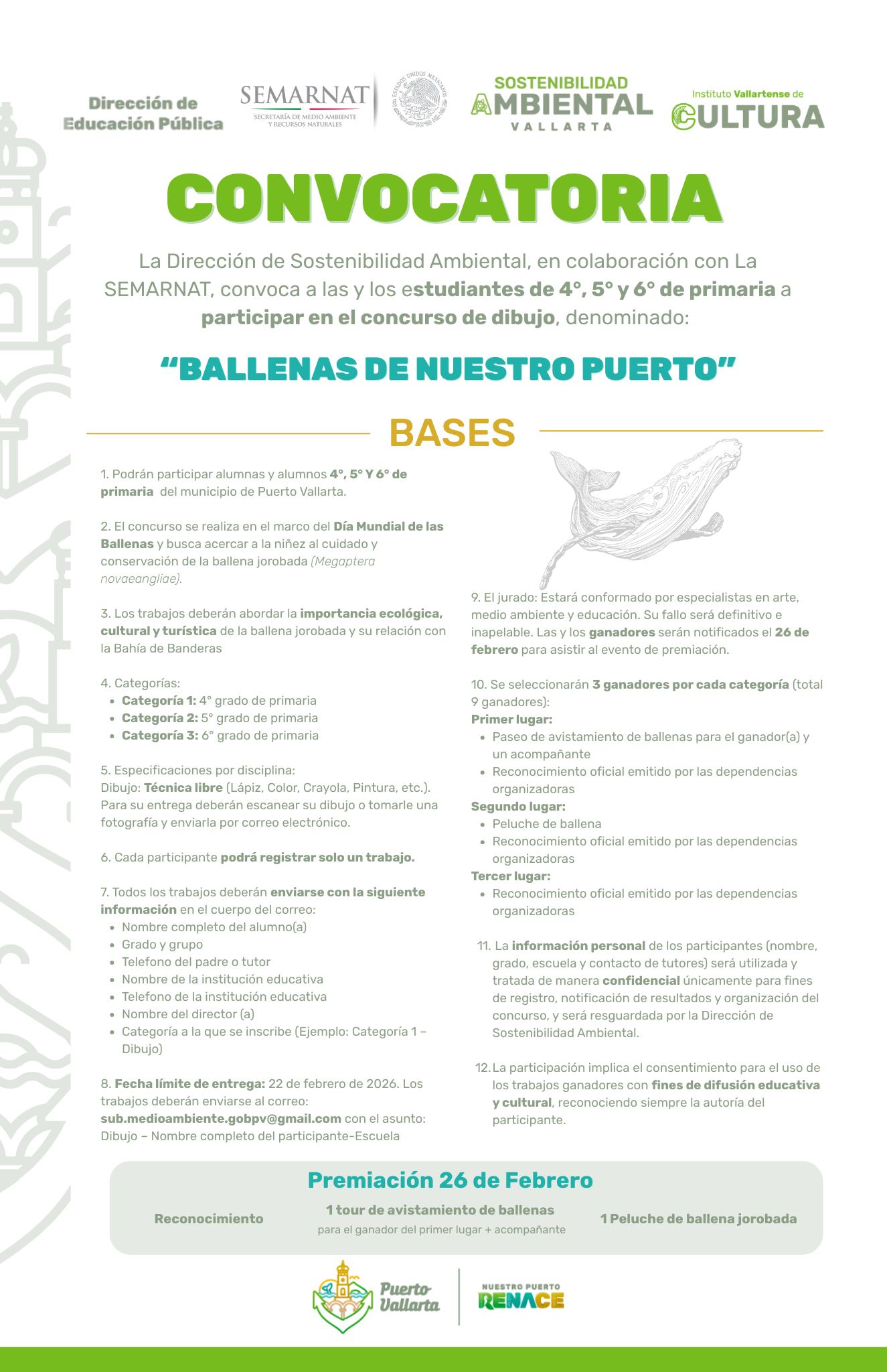 La convocatoria está dirigida a alumnas y alumnos de 4°, 5° y 6° de primaria del municipio, con el fin de fomentar la conciencia sobre la importancia ecológica, cultural y turística de la ballena jorobada y su relación con la Bahía de Banderas.