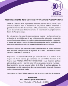 El colectivo feminista de 50+1 hace un enérgico llamado a las autoridades de Puerto Vallarta para que se esclarezcan y se investiguen con perspectiva de género los dos presuntos feminicidios cometidos en la semana que recién acaba.