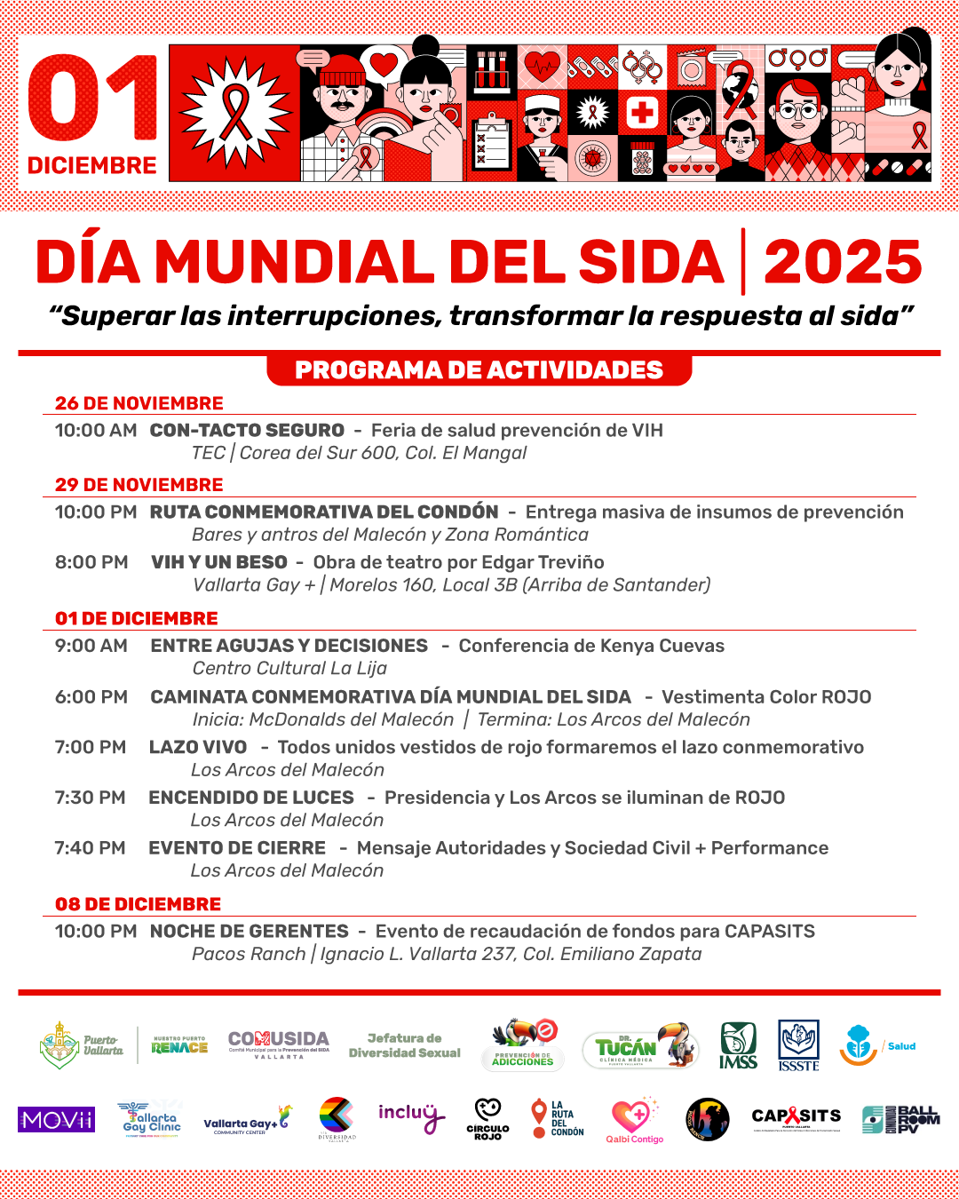 Las actividades inician este sábado 29 de noviembre con la presentación de la obra “VIH y un Beso”, de Edgar Treviño, a las 8:00 p.m. en Vallarta Gay+, como parte de las acciones culturales de sensibilización. Ese mismo día, a partir de las 10:00 p.m., se realizará la Ruta Conmemorativa del Condón, una intervención nocturna en bares y antros del Malecón y la Zona Romántica destinada a promover el autocuidado mediante la entrega de insumos de prevención.