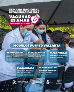 A partir de este lunes se habilitaron cinco módulos de vacunación en plazas públicas y el aeropuerto de Puerto Vallarta para ampliar la cobertura dentro de la Semana Nacional de Vacunación que arrancó oficialmente el fin de semana.