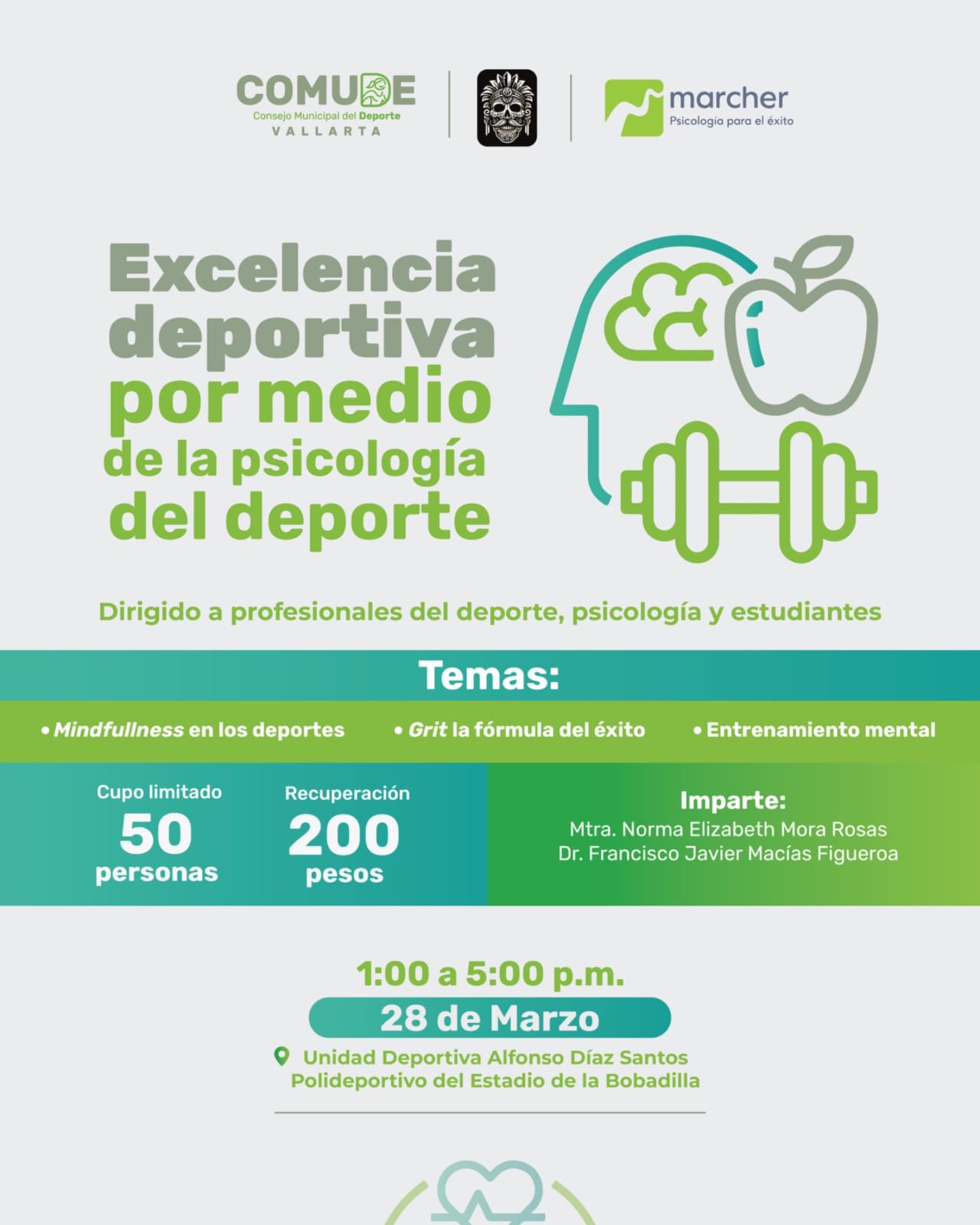 En un esfuerzo por seguir fortaleciendo el desarrollo mental, emocional y estratégico en el deporte, el próximo sábado 28 de marzo se llevará a cabo el curso “Excelencia deportiva por medio de la psicología del deporte”, de 1:00 a 5:00 de la tarde, en la Unidad Deportiva Alfonso Díaz Santos.