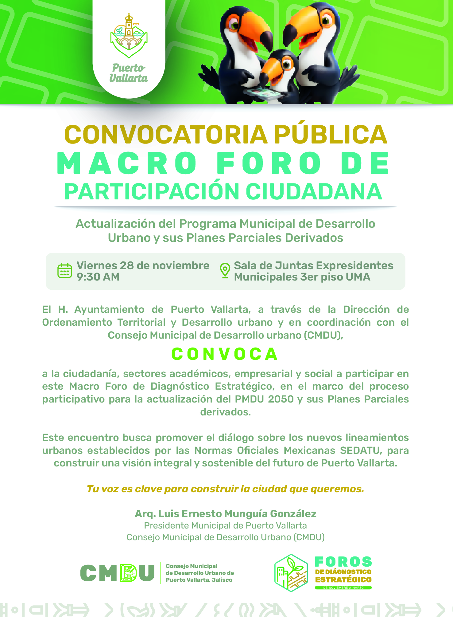 El Gobierno de Luis Munguía, a través de la Dirección de Ordenamiento Territorial y Desarrollo Urbano, y en coordinación con el Consejo Municipal de Desarrollo Urbano (CMDU), invita a la ciudadanía, sectores académicos, empresarial y social a participar en el Macro Foro de Diagnóstico Estratégico, que se llevará a cabo el viernes 28 de noviembre a las 9:30 am en la Sala de Juntas Expresidentes Municipales, 3er piso, UMA.