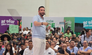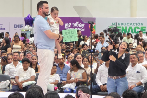 Previamente, con sus dos pequeños hijos en la primera fila, al inicio del evento masivo para presentar su Primer Informe, expuso: “Empezamos con la claridad de que las niñas y los niños de Puerto Vallarta deben tener condiciones mejoradas en sus planteles, espacios dignos para estudiar y un futuro con oportunidades reales”.