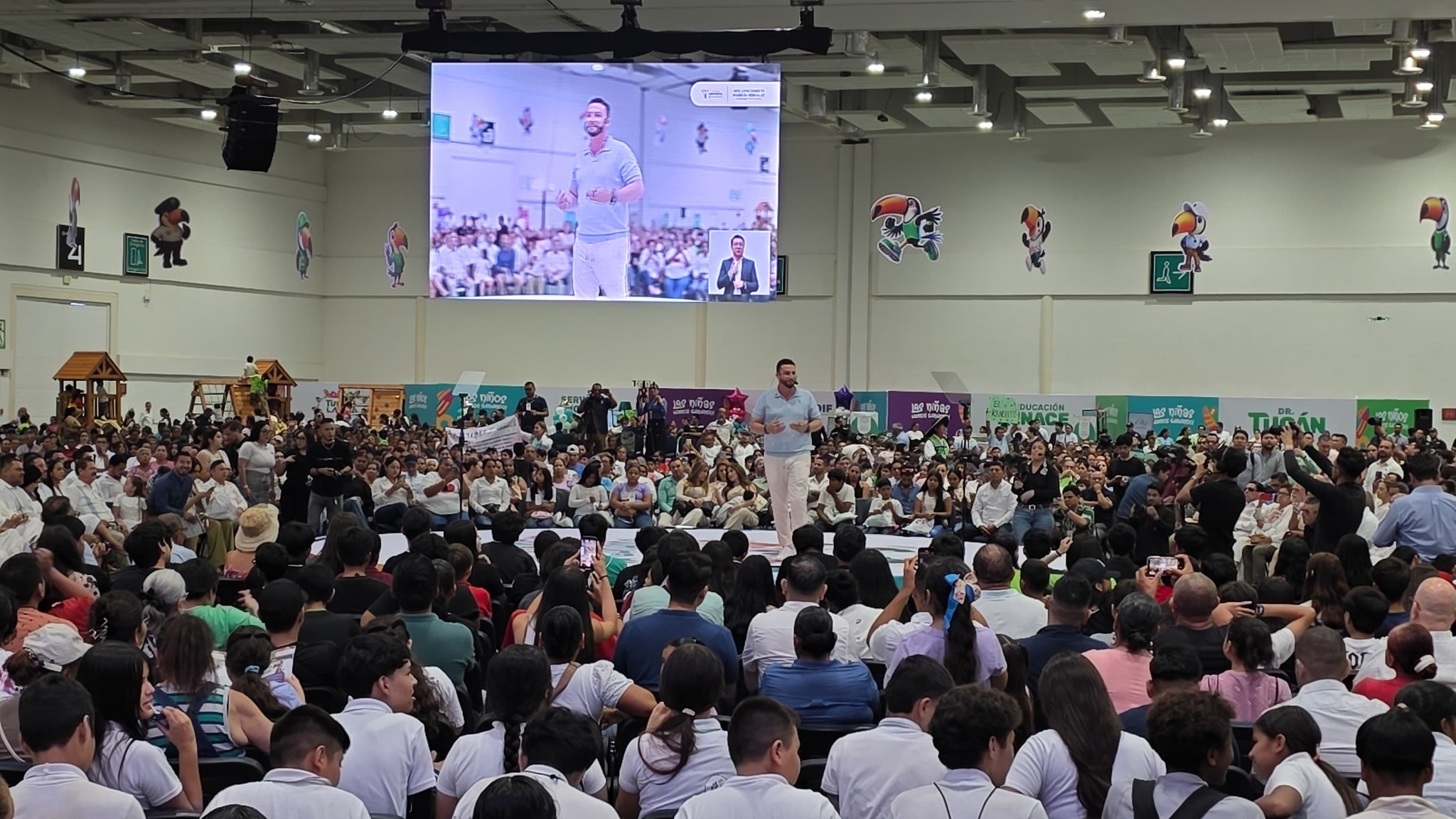 En medio del recinto en que se instalaron juegos que le hacían lucir como si fuese un salón de Fiestas Infantiles o Parque Recreativo, el alcalde anunció que el próximo año Puerto Vallarta se convertirá en el primer municipio en otorgar tablets a todos los alumnos de primaria, como parte del impulso a la educación digital.