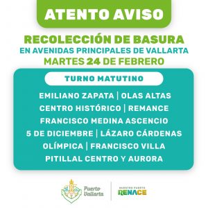 El Gobierno Municipal de Puerto Vallarta informa que este martes 24 de febrero, se llevará a cabo el servicio de recolección de basura por la mañana con camiones del Ayuntamiento, solo en algunas de las principales avenidas del municipio, como Emiliano Zapata, Olas Altas, Centro Histórico, Remance, Francisco Medina Ascencio, 5 de Diciembre, Lázaro Cárdenas, Olímpica, Francisco Villa, Pitillal Centro y Aurora.