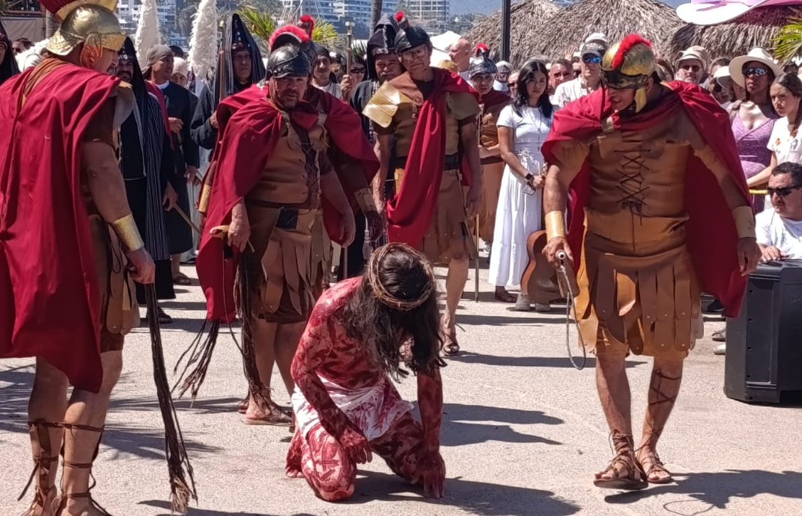 Fieles creyentes de la religión católica acompañaron la representación del Vía Crucis, en el marco de las actividades de Semana Santa en Puerto Vallarta, una recreación que se realiza desde hace 14 años en esta ciudad.