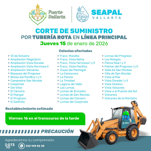 SEAPAL Vallarta informa que, derivado de la ruptura de una tubería de 24 pulgadas de diámetro en una línea principal que abastece a la parte alta de la delegación El Pitillal, este jueves 15 de enero se registra la interrupción temporal del suministro de agua potable en diversas colonias de la zona.