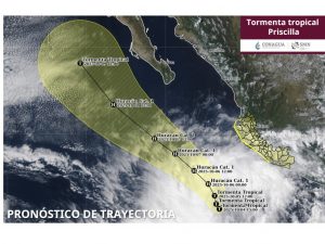 La tarde de este sábado se ha formado la tormenta tropical “Priscilla” a partir de una zona de baja presión ubicada al suroeste de las costas de Jalisco y Colima. Su amplia circulación ocasionará lluvias muy fuertes a puntuales intensas, fuertes rachas de viento y oleaje elevado en el occidente y sur del territorio nacional.